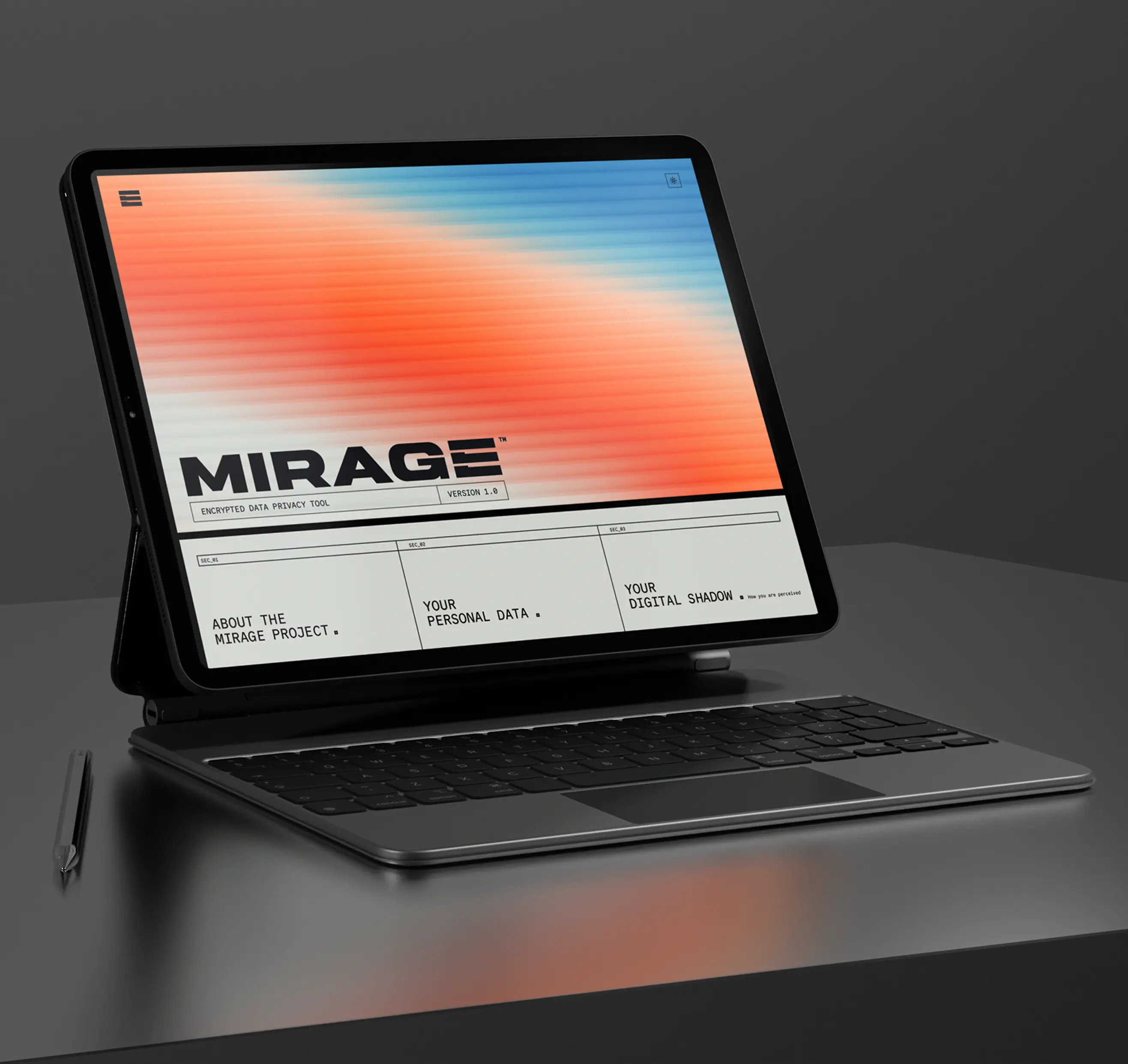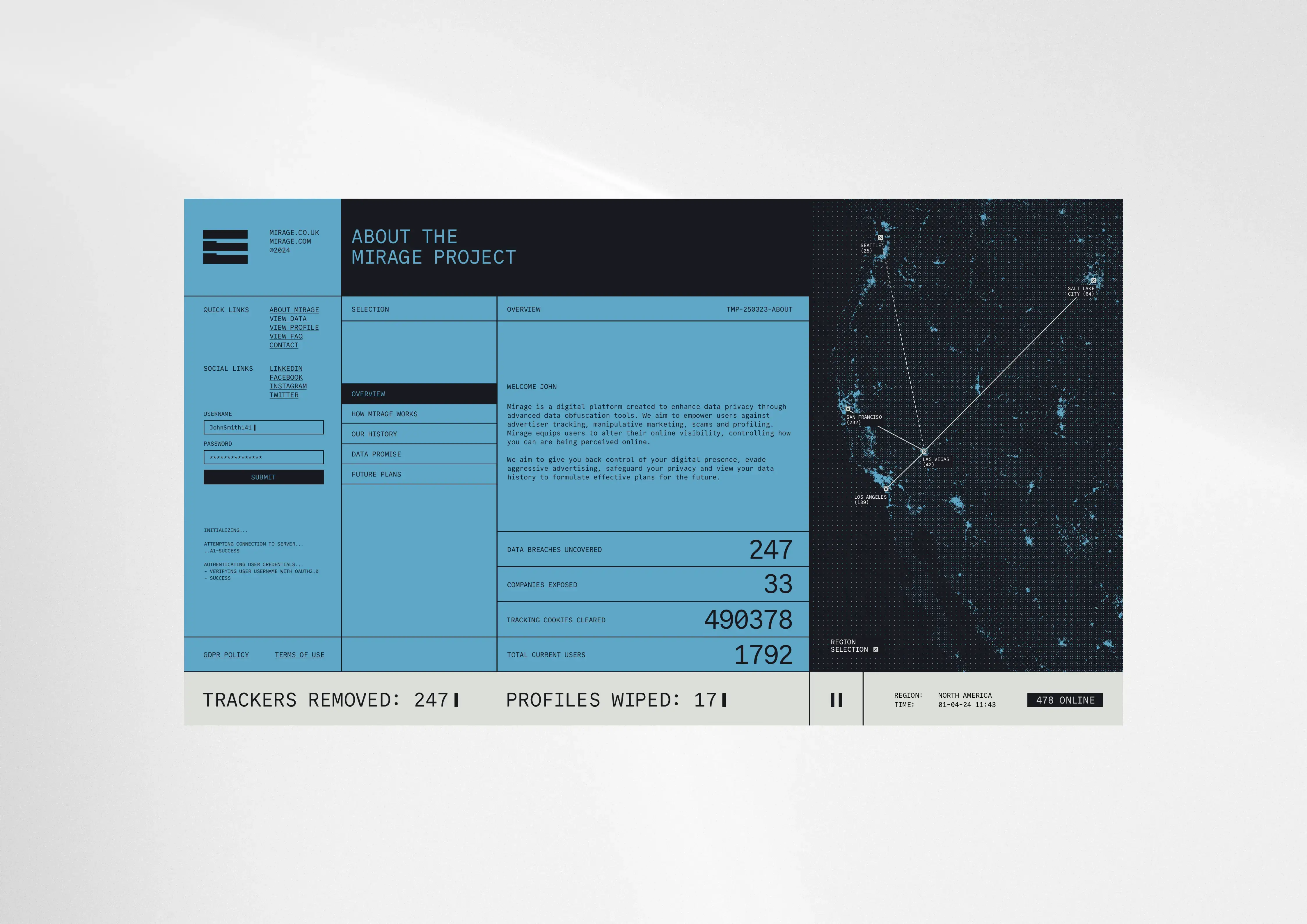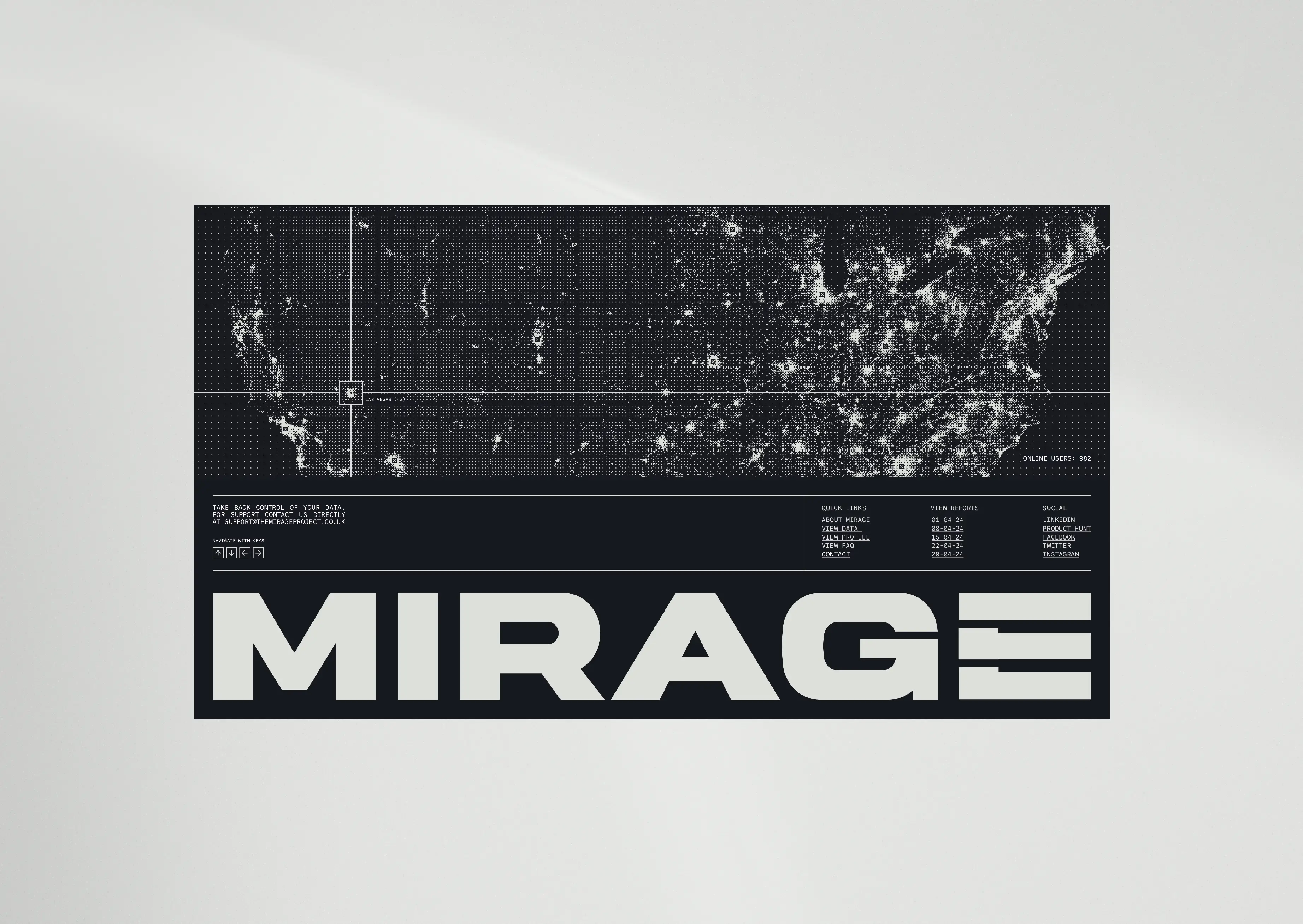 Everyday the world generates 2.5 Quintillion bytes of data. The average person can be identitifed with less than 10 data points. While they were active, Cambridge Analytica held 5000 datapoints on every American Citzen. MIRAGE is a response to the ‘Big Data’ 2024 ISTD brief, which looked to explore how big data can inform, misinform, improve, or erode aspects of our lives. Visually inspired by terminal interfaces and 80s/90s lofi-scifi, MIRAGE is a digital tool that will allow users to manage and control their datapoints, protecting them from data brokers and targeted advertising.