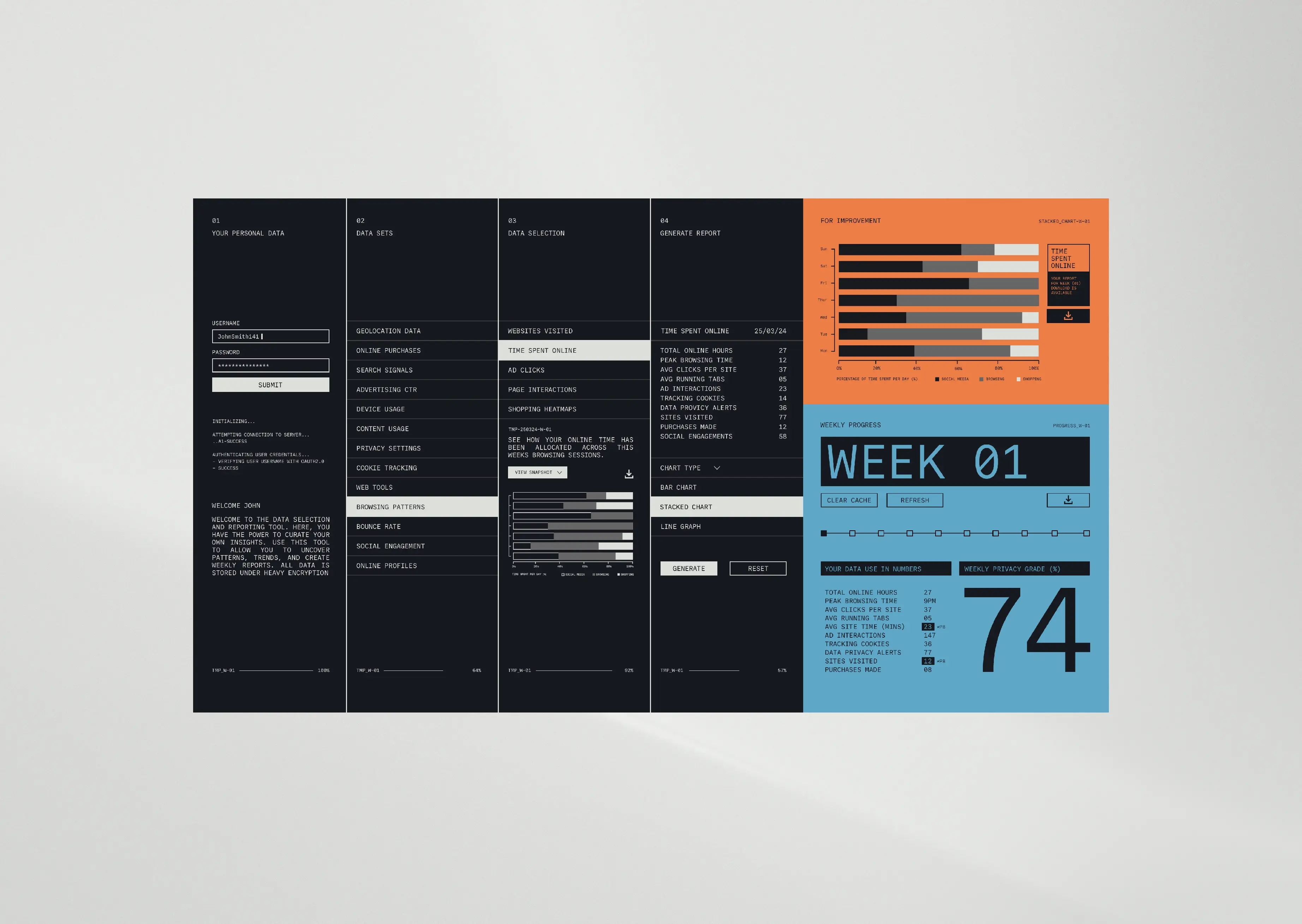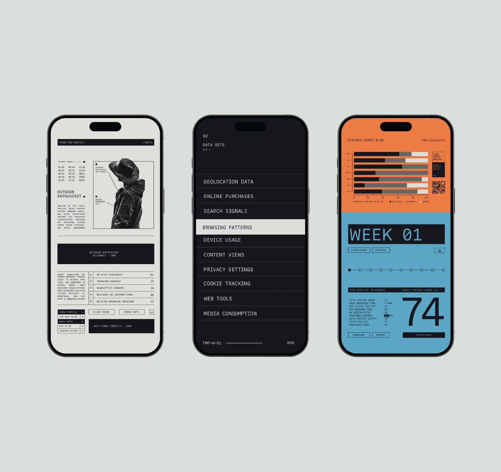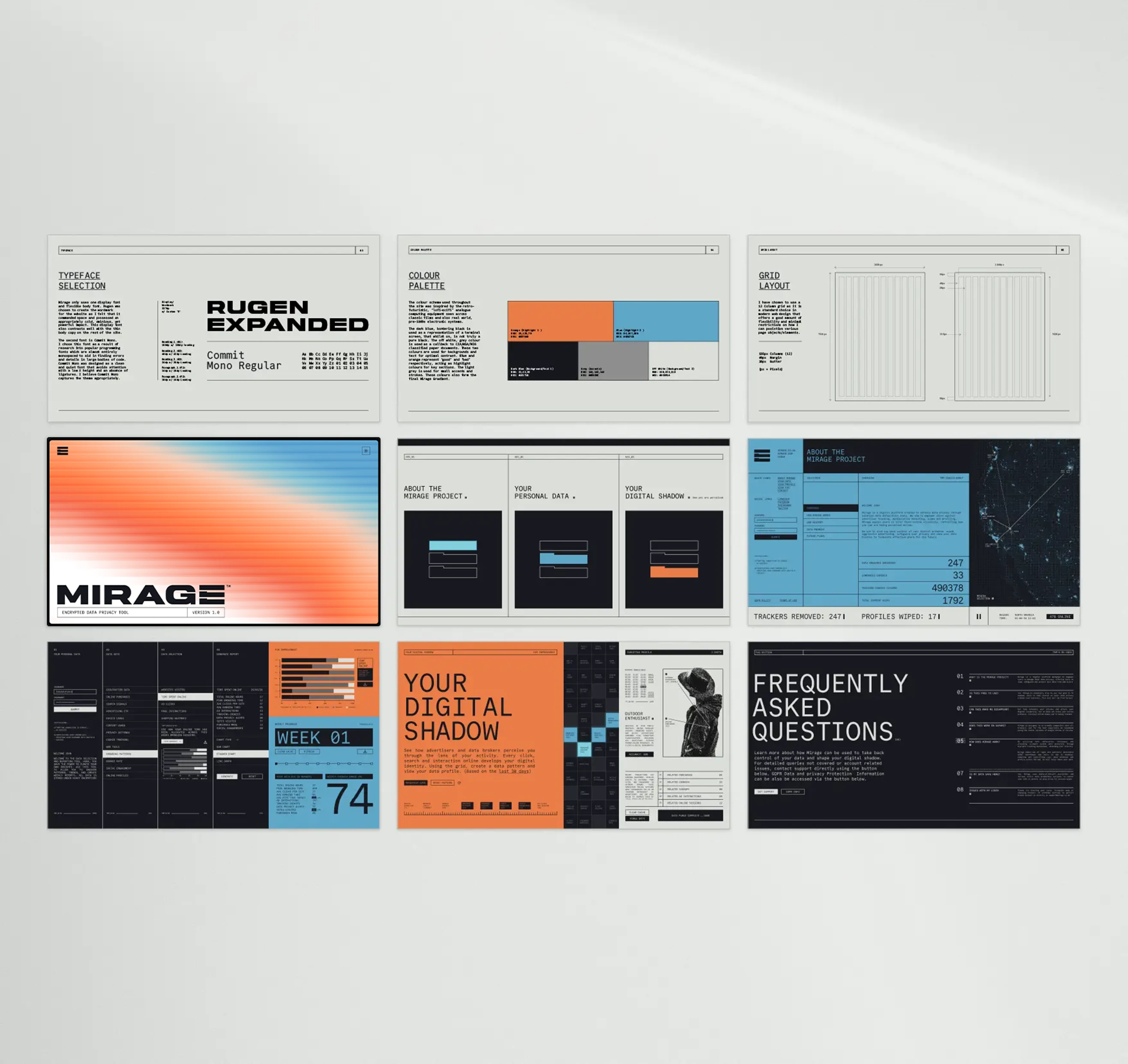Everyday the world generates 2.5 Quintillion bytes of data. The average person can be identitifed with less than 10 data points. While they were active, Cambridge Analytica held 5000 datapoints on every American Citzen. MIRAGE is a response to the ‘Big Data’ 2024 ISTD brief, which looked to explore how big data can inform, misinform, improve, or erode aspects of our lives. Visually inspired by terminal interfaces and 80s/90s lofi-scifi, MIRAGE is a digital tool that will allow users to manage and control their datapoints, protecting them from data brokers and targeted advertising.